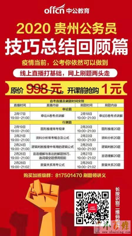特殊时期,贵阳中公教育推出1元购省考线上直播+讲义+刷题+回放12天技巧总结课,帮助大家备战省考,欢迎大家踊跃参与,尽在19课堂,入口:http://19.offcn.com/class-95927/,省考交流qq群:817501470GgY